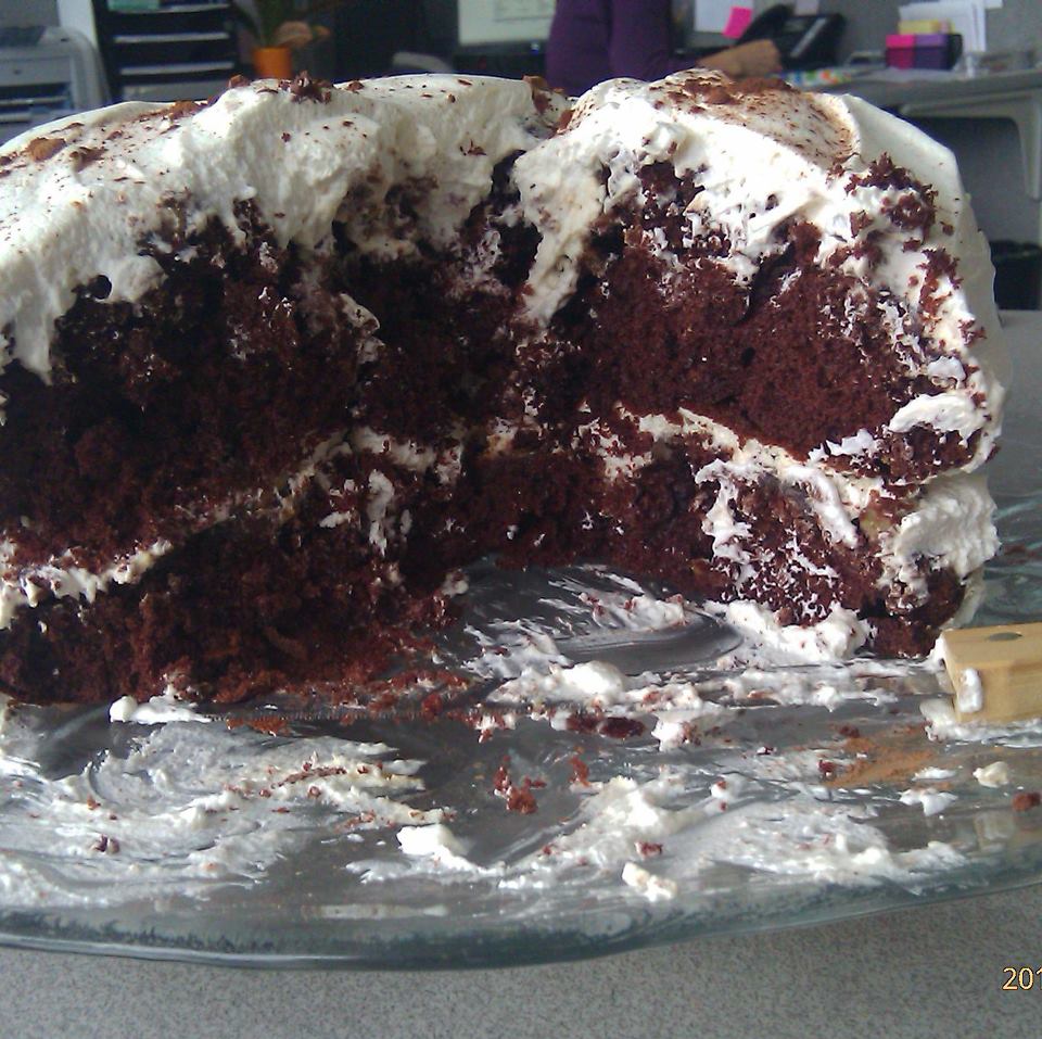 - To assemble the cake, place on cooled layer on a cake stand, praline-side up. Spread with half of the whipped cream. Place the second layer on top of the first, and spread the top with the rest of the whipped cream. Garnish the top with grated chocolate or mini chips. Drape with plastic wrap and chill until serving time.