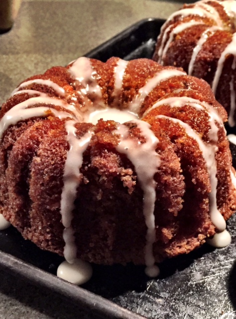Oven 350 degrees. Place carrots in a blender and chop them well. Mix all ingredients together in a mixing bowl, adding carrots and nuts last. Pour into a loaf pan and bake 60 minutes, or into mini loaf pans and bake 40 minutes, or into mini bundt pans like I did and bake 47 minutes, or muffin pans for 17 minutes. Allow to cool completely. Combine glaze ingredients and pour over cooled bread.
