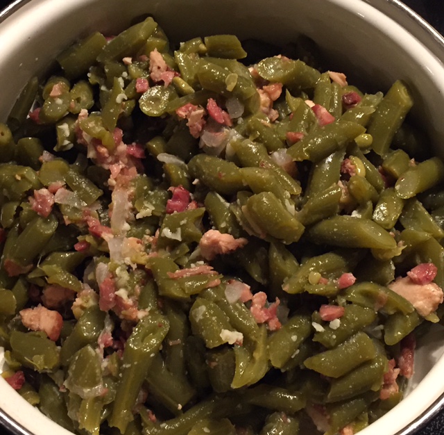 Cook the bacon and onions in a skillet till done. Pour green beans, sugar and vinegar into a saucepan and add two cans worth of water, or enough to cover the beans and begin cooking on medium heat. When it has cooled down a bit, add the bacon and onion mixture along with about two teaspoons of the grease from the bacon. Turn the heat down to low and cook for as long as you can, I aim for 4-6 hours. Stir every hour and add water as needed, probably 1-2 cups total. Salt and pepper as desired.