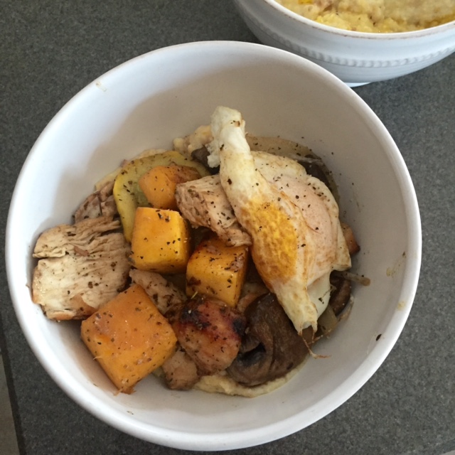 It’s been too cold for too long at our house. This calls for comfort food. I had some leftover Charleston Grits, grilled chicken and roasted vegetables. So I put them all together and placed an egg over easy on top. Nothing better.