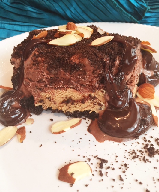 Set the ice creams on the counter to thaw while making the base layer. Annihilate the cookies in a food processor until you have crumbs. In a bowl, combine the cookie crumbs with melted butter until wet. Set aside 1/3 c of the mixture for later. Spread the cookies in a 13×9 pan to make the base layer. Scoop out the coffee ice cream and spread it over the cookie layer, using the entire quart. Do the same with the chocolate ice cream, spreading it over the coffee layer. Freeze for 1 hour. Pour the remaining cookie crumbs over the top and freeze until ready to serve. Cut into 3×3 inch squares and top with hot fudge and almonds.