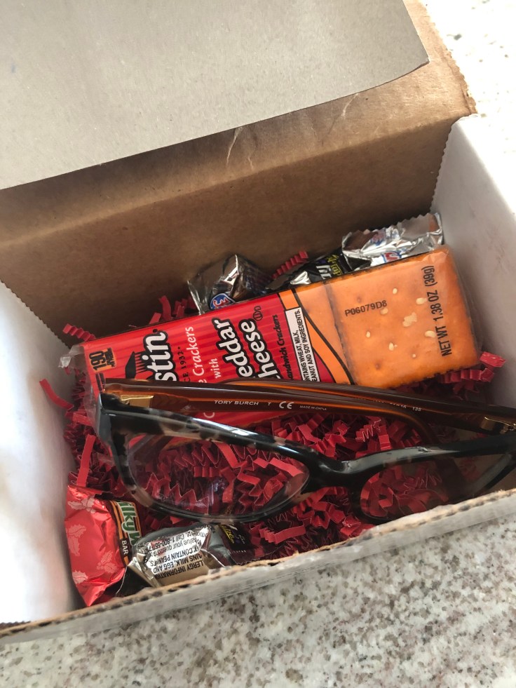 So last night I opened the heavily taped box and found my glasses, as well as an assortment of candy and crackers. It was simple but special. His way of saying he loves us.