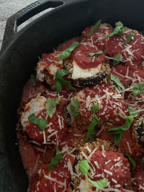 Coat the bottom of a cast iron skillet with tomato sauce. Layer the eggplant rounds on top of the sauce and top with mozzarella, continue until all eggplant and sauce and mozzarella has been used. Bake at 350 degrees for 20 minutes. Allow to cool for five minutes and sprinkle parmesan cheese and fresh basil over the top before serving.
